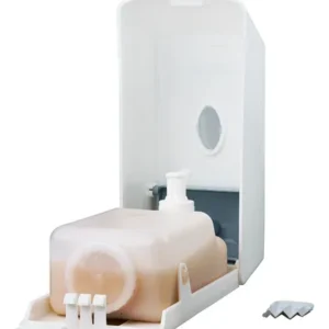 Dispenser de pared para jabón líquido de 900 ml en PVC blanco. Dosificación manual, visor frontal y llave de seguridad. Ideal para uso diario.