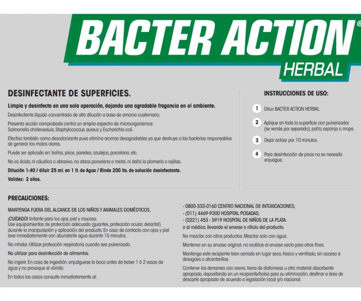 El Bacter Action Herbal es un desinfectante líquido concentrado de alto rendimiento, formulado a base de amonio cuaternario (cloruro de benzalconio 4%), ideal para la desinfección total de superficies en hogares, industrias e instituciones.