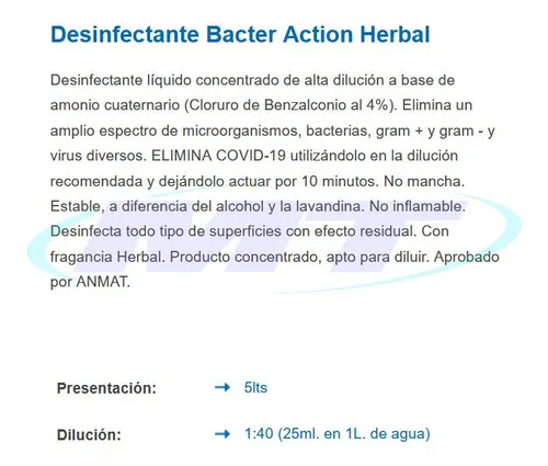 Desinfectante Bacter Action Herbal 5 L. Amonio cuaternario concentrado elimina bacterias, virus y COVID-19. No mancha, no es tóxico y tiene fragancia herbal.