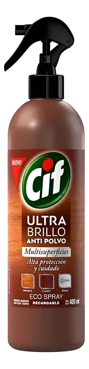 El Cif Lustra Muebles Ultra Brillo Anti Polvo combina eficacia, practicidad y brillo prolongado, manteniendo tus superficies limpias, protegidas y relucientes con cada aplicación.