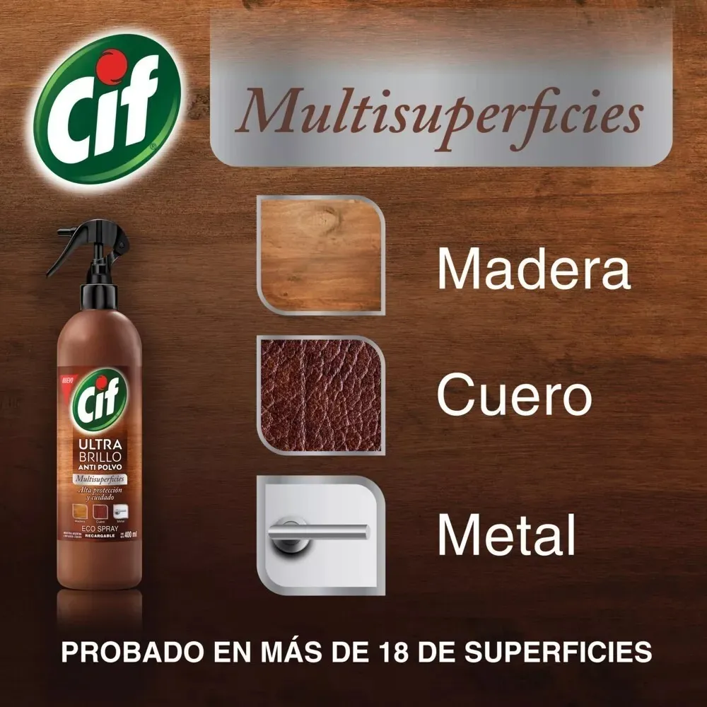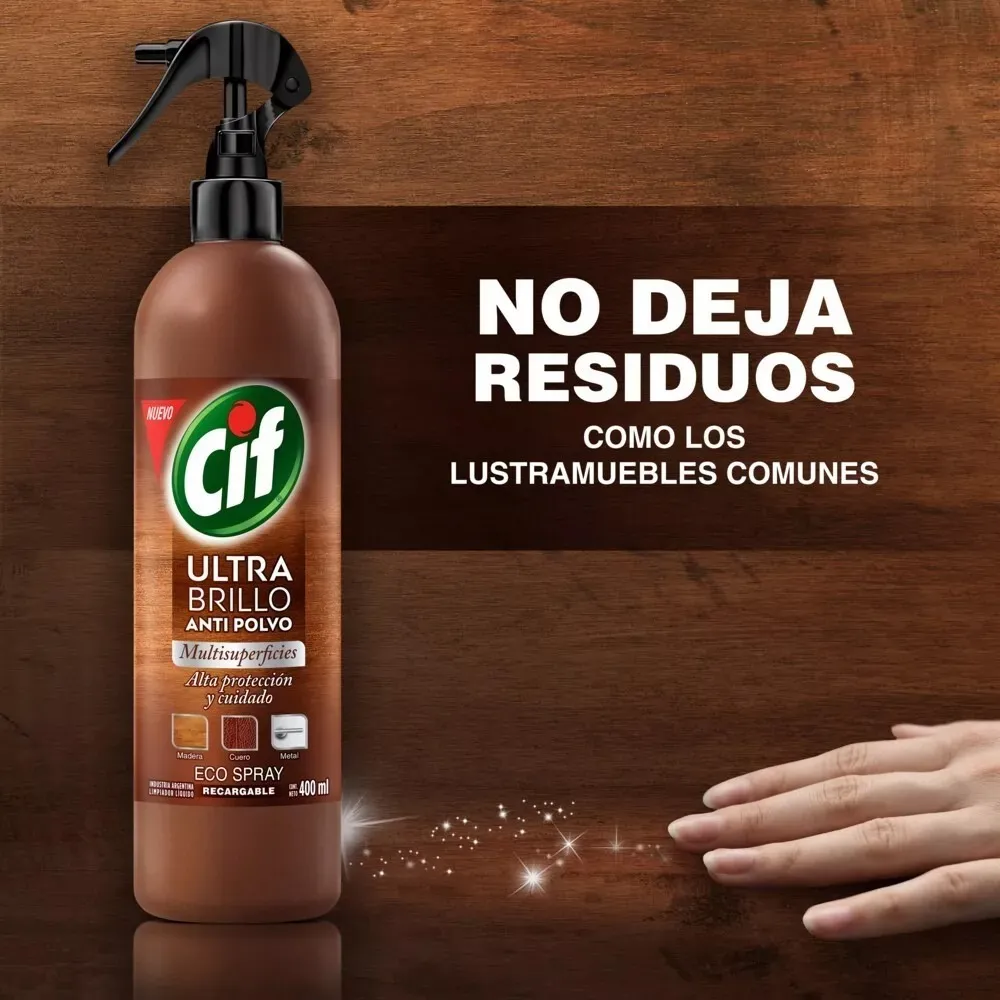 Cif Lustra Muebles Ultra Brillo 400 ml con gatillo. Limpieza y brillo instantáneo en multisuperficies. Fórmula anti polvo y secado rápido.