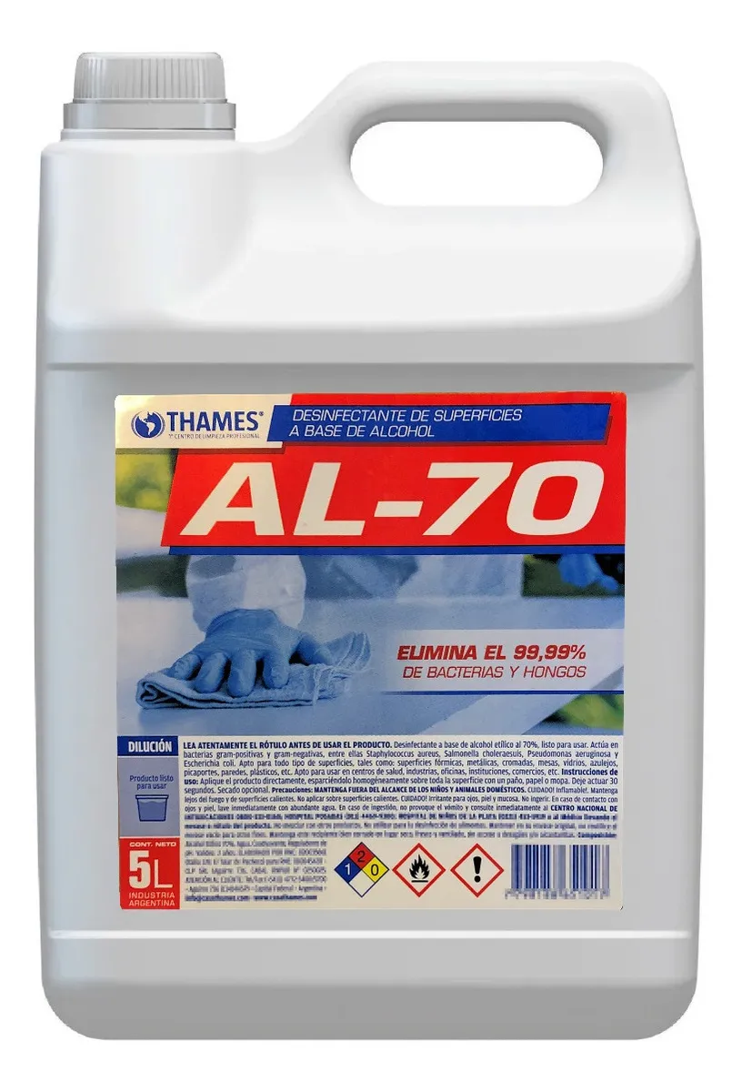 Desinfectante alcohol 70% 5 L listo para usar. Limpieza y desinfección total de superficies. Acción bactericida y viricida profesional. Ideal uso institucional.