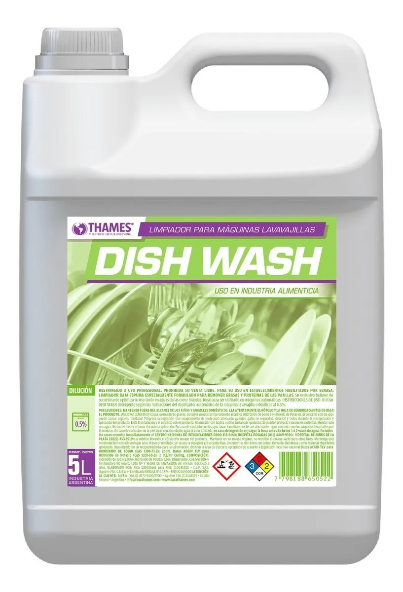 Detergente Dish Wash 5 L. Concentrado, baja espuma, elimina grasa y proteínas. Ideal para máquinas automáticas. Aprobado por SENASA.