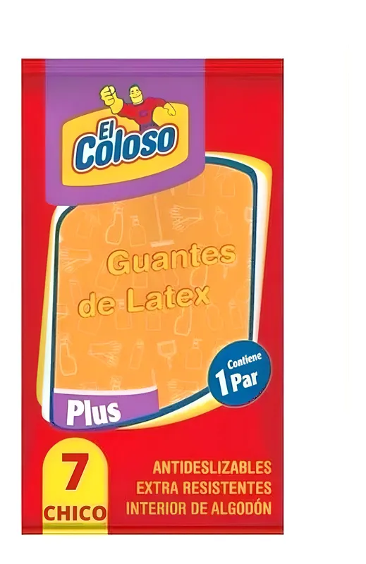 Guantes de látex El Coloso. Resistentes, cómodos y antideslizantes. Ideales para limpieza y uso doméstico. Con interior de felpa. Talles chico, mediano y grande.