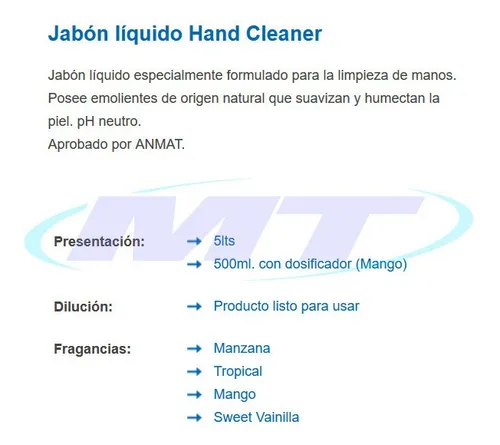 Jabón líquido para manos Hand Cleaner Manzana 5 L. Fórmula con emolientes naturales, pH neutro y aprobado por ANMAT. Suaviza y humecta la piel.